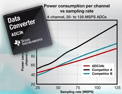 A pesar de sus elevadas prestaciones, los ADC de 25 a 160 Msps ADC3k sólo consumen 200 mW por canal (unos 80 mW por canal menos que dispositivos similares). La potencia se escala a 44 mW por canal a 25 Msps.