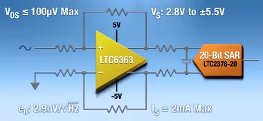 Linear Technology presenta el LTC6363, un amplificador diferencial de precisión de baja potencia y elevada exactitud optimizado para acondicionar señales para los ADC ΔΣ y SAR de 16, 18 y 20 bits de alto rendimiento.
