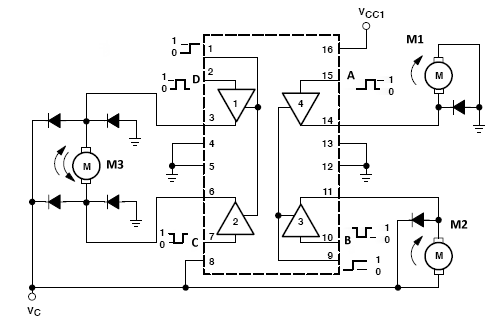 El circuito eléctrico en el que nos basaremos es el recomendado por el fabricante del IC y que es mostrado en la siguiente figura. Podemos distinguir dos pares de amplificadores con salidas triestado, con un control habilitador (EN) común para ambos, cuyas propiedades descubriremos más adelante. Por el momento nos ocuparemos de la parte sencilla.