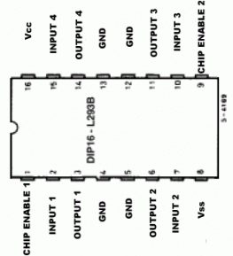 Además con el L293, no tiene que preocuparse por la regulación de una tensión mayor, ya que permite dos fuentes de energía – una fuente directa, hasta 36 V para los motores y otra de 5V, para controlar el CI que, puede ser conectada a la fuente de alimentación ya que el suministro de alimentación del motor proviene es independiente. En el circuito de abajo, se supone una alimentación superior para el motor. A continuación se puede ver la disposición de las conexiones para el chip y el motor. La tabla de verdad muestra la lógica de la salida.