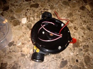 Las fotos, aunque corresponden a otro ejercicio (cosa que no es relevante), dan una idea de lo que se describe. La práctica demostrará cómo mover un objeto (bot-tarrina), con un sólo motor y un interruptor del tipo ‘bumper’. Cuando conectemos la tensión, el Arduino mandará una señal al motor para que gire, por un tiempo, lo que hará avanzar el pequeño robot. Cuando éste, encuentre un obstáculo, lo detectará con el interruptor que tropezará con el objeto estático, esto producirá una señal/orden en el programa, de modo que el motor cambiará su dirección de giro por un tiempo determinado, tras el cual volverá a girar en la dirección de inicio. Las direcciones son mecánicamente, bastante aleatorias.
