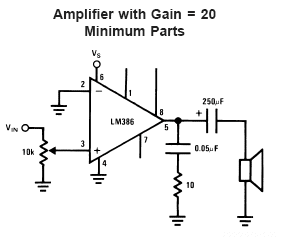 El LM386 es un amplificador de potencia, diseñado para el empleo en usos de consumo de voltaje bajos. La ganancia interna es puesta a 20 para mantener la parte externa en cuenta baja, pero la adición de una resistencia externa y un condensador entre los pines 1 y 8 aumentarán la ganancia a cualquier valor entre 20 y 200.