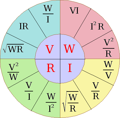 En este gráfico puede apreciarse que hay cuatro cuadrantes que representan: V Voltaje, I Corriente, R Resistencia y W Potencia. De modo que, conociendo la cantidad de dos cualesquiera, nos permite encontrar el otro valor. Por ejemplo, si se tiene una resistencia de 1k y en sus extremos se mide una tensión de 10 Voltios, entonces la corriente que fluye a través de la resistencia será V/R = 0’01A o 10mA.
