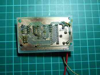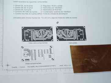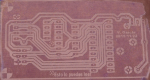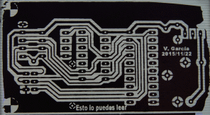 Si está interesado en realizar este PCB, y no está familiarizado en como utilizar la película (film) en sus trabajos, le sugiero que se asegure como poner el papel impreso sobre la película (film) de modo que pueda leer el texto “Esto lo puedes leer“, está ahí para que no se equivoque (le aseguro que no sería la primera vez), también yo he errado. La imagen siguiente, se aprecia que aún no se ha quitado el film protector. He utilizado una lámina DIN A4 transparente para obtener un mejor resultado, sin embargo la tinta impresa no es suficientemente opaca y la desestimé, mejores resultados en papel.