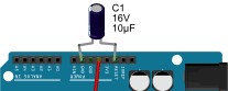 común en la placa Arduino – en la mía no siempre se manifiesta el problema). Es posible, por ejemplo, obtener el mensaje de “error: avrdude_stk500_getsync(): not in sync: resp=0x15“. Si es así, puede que tenga que poner un condensador de 10uf entre los pines de la placa Arduino “Reset” y + del electrolítico y su negativo al GND.