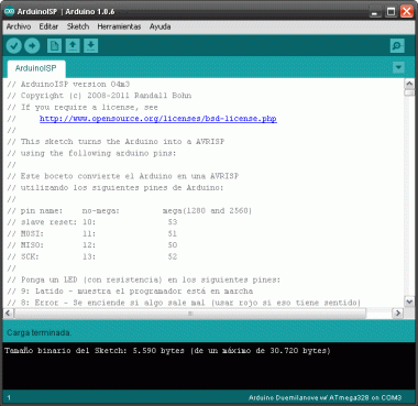 Este es el aspecto que presentan los pasos que vamos dando. Al terminar la carga de Arduino ISP.