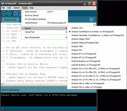 Ha llegado el momento de convertir nuestro Arduino en un programador ISP que nos asista en esta tarea. En este procedimiento se mostrará cómo convertir un Arduino Uno (Duemilanove) en Programador In-Sistema o ISP. El ISP permite programar los microcontroladores AVR y reprogramar, in-situ (sin tener que quitarlos del circuito en el que han de trabajar). Para programar cualquier microcontrolador AVR, mediante 6 cables, realmente son cuatro más la alimentación +VCC y GND.