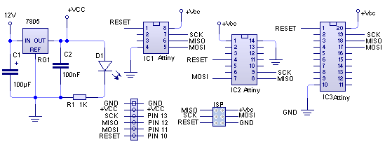 Como he mencionado entes, vamos a construir una pequeña placa con la que podremos programar cualquiera de los pequeños micros que nos presenta AVR, como la mayoría he realizado pruebas utilizando tan socorrido protoboard, y pensando en construir una pequeña placa me decidí a trazar una más completa que sirviera para distintos modelos de micros y para esto lo primero que hay que preparar es el esquema.
