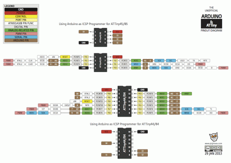 Los micros ATtiny son pequeños microcontroladores de 8 bits con poca memoria flash y memoria EEPROM, encapsulados desde los 6 pines hasta los de 32 pines el más grande. Existe un abanico de esquemas en otras tantas páginas, así que, resumiendo este que sigue podemos decir que cubre las opciones que me he propuesto para este útil de programación, creando un escudo Arduino para programar el ATtiny85, el ATtiny84. No es complicado de seguir y bastante sencillo para realizar.
