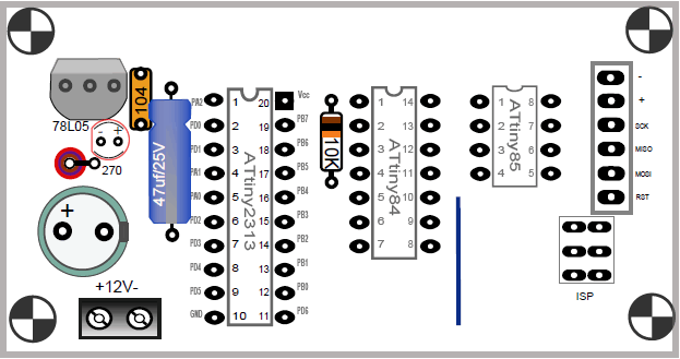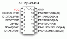 - ATtiny44 – 4kb flash de almacenamiento y 14pins