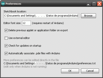 Debemos acceder al Arduino que utilizamos para compilar los programas, para localizar el archivo “boards.txt“, abrimos el IDE y vamos al menú Archivo/Preferencias o si lo prefiere pulse “Ctrl+coma” y se abrirá una ventana a cuyo pié se indica la localización del archivo. Abramos el archivo y editémoslo: