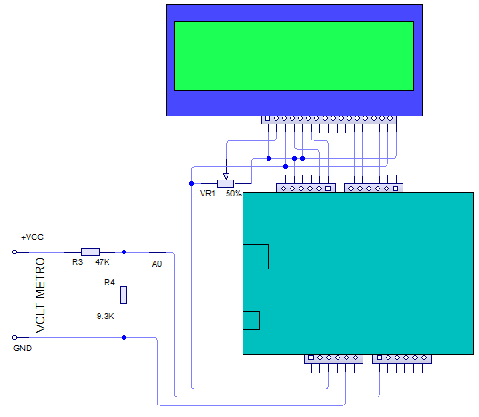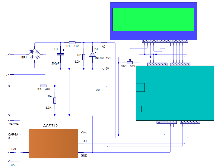 Creo que estamos en el buen camino. Hemos logrado realizar un voltímetro en este sitio, aquí, hemos conseguido el amperímetro y ahora es cuestión de unificar ambos códigos y habremos logrado realizar el dispositivo que propició el proyecto. Así que, manos a la obra, el siguiente es el circuito que nos permitirá leer la tensión y la corriente de salida sobre una carga.