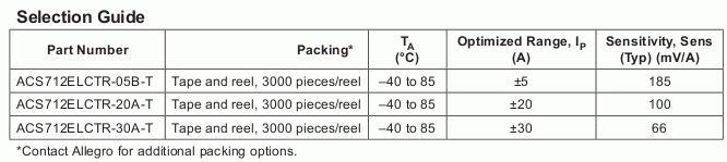 Tensión de salida en reposo (Viout (Q)). La salida del sensor cuando la corriente primaria es cero. Para una tensión de alimentación unipolar, sigue siendo nominalmente VCC / 2. Por lo tanto, cuando no hay corriente la tensión de salida es VCC / 2 = 5 V / 2 = 2.5V. La variación en Viout (Q) se pueden atribuir a la resolución de la compensación de tensión de reposo IC Allegro lineal y la deriva térmica. Parece muy complicado, lo intentaré más sencillo.