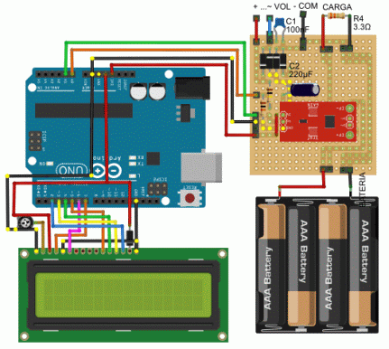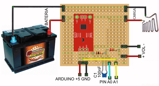 En la imagen se muestra un indicador que dice BATERÍA, se refiere a la tensión continua externa (puede se de 5V o más) que se aplicará a la CARGA, mostrada en el otro lateral como ya he dicho, la tensión en ambas tomas o bornas, es distinta de la tensión digital de Arduino o en micro-controlador en uso. Se puede ver el sensor ACS712 y el divisor de tensión implicado en la lectura de la tensión de salida, se evidencian las salidas referidas al pin A0 para la tensión y el pin A1 para la corriente. El condensador de 100nf es para tirar a masa las tensiones espúreas.