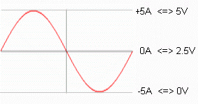 Para comprender mejor esto, supongamos que este sensor mide intensidades entre -5A y +5A (vea su modelo que alcance tiene). Ya que la salida del sensor según la hoja de datos siempre entrega entre 0 y 5 voltios, cuyo valor de 0A se corresponde con los 2.5V en la salida, y por cada amperio la tensión varía 185 mA. Este sensor puede medir tanto CC como CA, si vemos una sinusoide, el punto más bajo se corresponde con los -5A, de modo que los 2.5V de salida corresponden justo a 0A y los +5A con los 5V, véase la imagen que sigue.