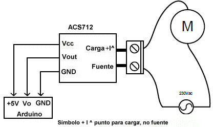 Una vez empecé el artículo y a medida que avanzaba me di cuenta que si además de voltímetro midiera la corriente de consumo, estaría más completo y de esta forma tuve que adquirir uno de estos dispositivos, y esa es la razón de este artículo. El esquema práctico de conexionado es sencillo y fácil de entender. Se trata de conectar el sensor en serie con la carga que queremos conocer la corriente de consumo.