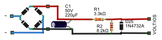 Antes de presentar el código previsto, he pensado en realizar un pequeño añadido como es, hacer que nuestro voltímetro pueda leer tensiones alternas hasta 30V. Esto se puede realizar al menos en teoría, mediante la aplicación de un puente rectificador para que su salida lea la tensión una vez rectificada naturalmente, debemos hacer un filtrado para que nuestra lectura no se desvíe de la realidad y un divisor de tensión para que devuelva el valor real en alterna.
