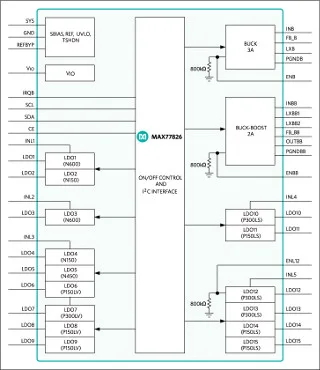 El circuito para gestión de potencia en Smartphones MAX77826 ofrece lógica de control on/off y una interfaz serie I²C para programar tensiones de salida de regulador y gestión on/off para añadir flexibilidad.