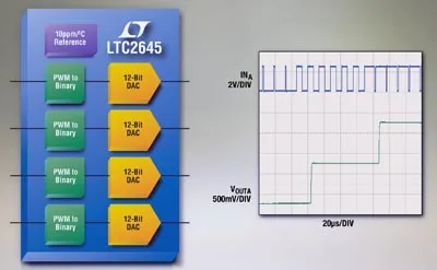 Linear Technology Corporation presenta el LTC2645, un convertidor PWM a salidas de 12 bit,digital a analógico (CDA), de canal cuádruple, de 12, 10 u 8 bit y con referencia 10ppm / °C. Estos componentes convierten señales de entrada PWM a salidas de tensión de 12 bit precisas, estables y con búfer en menos de 8 µs, eliminando el rizado y el retardo normalmente asociados a los filtros analógicos.
