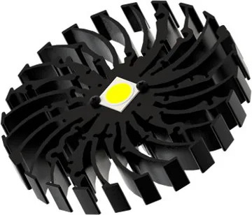 El desafío en este tipo de disipadores para aplicaciones de bajo perfil parte de la difusión de la fuente de calor por el resto del diseño mediante la creación de suficiente superficie de refrigeración en un perfil bajo y con un gran diámetro del disipador, esta parte no es tan difícil debido a que las áreas que cubren los COBs han aumentado más del 40% en los últimos dos años para obtener un control de luz irradiada más fácil con la óptica secundaria.