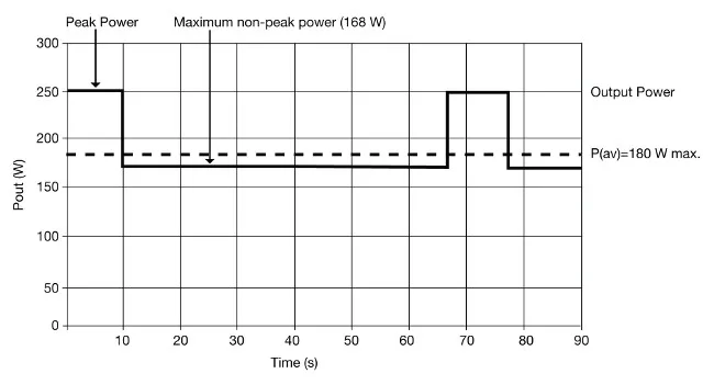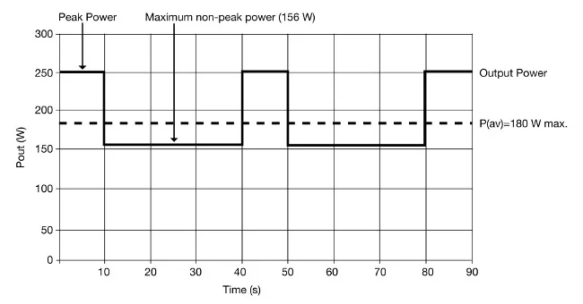 Operando sin ventilación forzada, donde el sistema requiera una carga de pico de 250 W de 10 segundos por cada 40 segundos o un ciclo de trabajo del 25%. Este requisito de pico de carga (Ppk) define la máxima potencia durante el régimen de trabajo sin picos de carga, y así la potencia media no superará la potencia dada por convección.