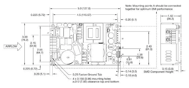 Con el fin de garantizar un funcionamiento seguro de la fuente de alimentación en el equipo final, no se deben superar las temperaturas de los componentes que aparecen en el listado de la figura 5. La temperatura podría monitorizarse utilizando termopares de tipo K, colocados en la parte más caliente del componente (fuera del flujo de aire directo). Ver detalles mecánicos para la ubicación de estos componentes en la figura 4.