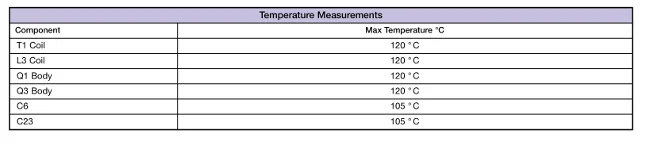 Los cálculos muestran que estas condiciones de funcionamiento no excedan las especificaciones de la fuente de alimentación. De todas formas, como hemos comentado anteriormente, hay que considerar también las temperaturas de los componentes clave de la fuente, cuando se instale en el equipo final para garantizar un funcionamiento seguro y fiable durante la vida útil diseñada para esos equipos.