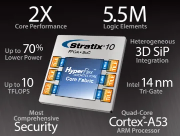 La familia de SoCs y FPGAs con tecnología de 14 nm Stratix 10 de Altera disponen de 5,5 millones de elementos lógicos en una sola die, con hasta 144 transceptores que proporcionan cuatro veces el ancho de banda serial que la generación precedente.
