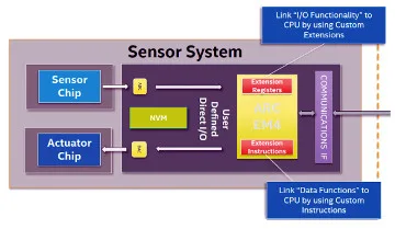 El subsistema de sensor es una solución que incorpora hardware y software para tareas de control en el procesamiento de señales de entrada analógicas y digitales. Esto mitiga la carga en el procesador host y el procesamiento de datos de sensor en modo Low Power relativo al procesador host. El procesador de 32 bit requerido para este propósito – un procesador de señal digital ARC EM4 DSP – cuenta con bloques de función acoplados estrechamente para beneficiarse de un acceso con mínimo tiempo de latencia. El subsistema de sensor se compone de una serie de comandos específicos Intel para fracciones, procesamiento de números complejos, generación de funciones de seno / coseno y unidades de coma flotante (FPU). El acceso se ofrece a una caché de instrucción 8 KB L1 y a una memoria de 8 kB Data CCM (Closely Coupled Memory – memoria acoplada al núcleo).