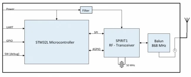 Este módulo RF sub-GHz flexible, con formato compacto (15 x 14 mm) para ensamblaje SMT, se caracteriza por un microcontrolador de ultra bajo consumo STM32L0, un transceptor sub-GHz SPIRIT1 low-power y BALF-SPI-01D3 Balun.