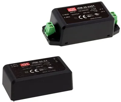 La serie IRM-30 con una entrada de 85 a 264 VAC se compone de módulos de alimentación miniaturizados con cinco modelos con diferentes tensiones DC de salida única (5, 12, 15, 24 y 48 V), eficiencia de hasta el 90 por ciento y refrigeración por convección (rango de temperatura operativa de -30 a +70 °C).