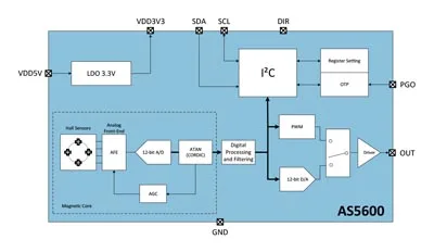 El AS5600 puede ser alimentado por una fuente de 5 V mediante el regulador LDO en el chip, o bien directamente desde un suministro de 3,3 V. La programación es a través de una interfaz I2C.