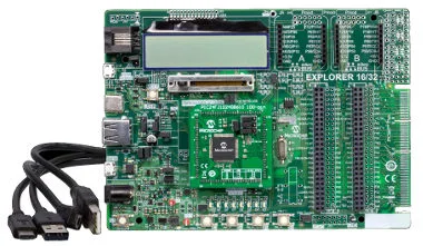 El kit de desarrollo Explorer 16/32 (DM240001-3) incluye la tarjeta de desarrollo principal Explorer 16/32, un módulo PIM PIC24FJ1024GB610 y dos cables USB. El módulo PIM incorpora un microcontrolador PIC24FJ1024GB610 de 16 bit con 1MB de Flash, una memoria superior y funciones para la familia PIC24F de menor consumo. Este kit con PIM y cables tiene un precio de 109,99 dólares.