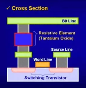 La RAM resistiva de Panasonic se basa en una estructura de celda en la que un binario «1» y «0» se lee en base a la resistencia de un óxido de película delgada de metal (óxido de tántalo) intercalada entre dos electrodos en la parte superior y en la parte inferior del óxido metálico. El estado de la celda de memoria se cambia a un «1» mediante la aplicación de una tensión de pulsos negativa al electrodo superior. Esto hace que los iones de oxígeno migren al óxido de tántalo, reduciendo la resistencia y haciendo a la célula conductora de la electricidad.